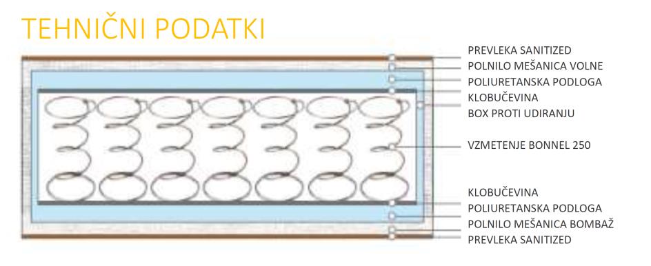 Vzmetnica je sestavljena iz prbl. 250 dvostožčastih vzmeti Bonnel (dimenzija 90 x 200 cm), ki zaradi svoje velike nosilnosti zagotavlja popolno udobje in pravilno podporo celotnemu telesu. Vzdolž oboda vzmetnice je okvir proti udiranju, ki odpravlja neprijeten občutek drsenja in preprečuje elektromagnetsko sevanje, kar zagotavlja bolj sproščen in globok spanec.