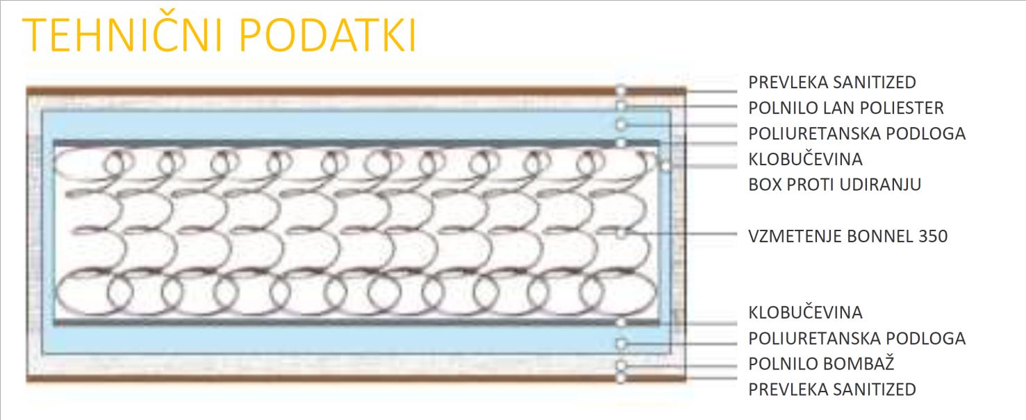 Vzmetnica je sestavljeno iz prbl. 350 dvostožčastih vzmeti Bonnel (dimenzija 90x200), ki zaradi svoje velike nosilnosti zagotavlja popolno udobje in pravilno podporo celotnemu telesu. Box proti udiranju, ki je vzdolž oboda vzmetnice, poleg tega, da odpravlja neprijeten občutek drsenja, tudi preprečuje elektromagnetsko sevanje, kar zagotavlja bolj sproščen in globok spanec. Na strani vzmetnice je dodanih 18 mikro prezračevalnikov za večjo higieno ležišča.