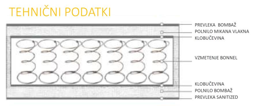 Vzmetnica je sestavljeno iz prbl. 180 dvostožčastih vzmeti Bonnel (dimenzija 90 x 200 cm), ki zaradi svoje velike nosilnosti zagotavlja popolno udobje in pravilno podporo celotnemu telesu. Prevleka vzmetnice je bombažna in zavira nastanek pršic polnjeno z mikanimi vlakni.