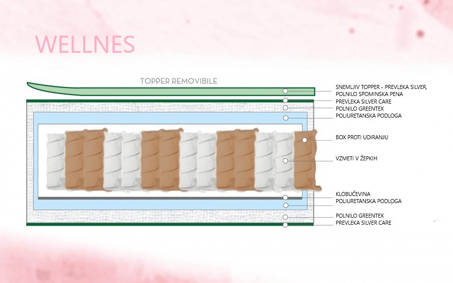 Inovativna blazina Topper je estetsko značilen element modela Wellness, polnjena z udobno in učinkovito spominsko peno. Za izboljšanje izjemnih ergonomskih lastnosti modela Wellness prispevajo vzmeti v žepkih s 7 podpornimi conami. Jedro je prekrito z Ergoflex bloki in obodnim boksom s stranskimi ojačitvami proti drsenju in udiranju. Pokrita s hipoalergeno in antistatično tkanino Silver Care, prijetna in udobna na dotik. Ta model ima sistem za obodno prezračevanje 3D-SPACE, ki je sestavljen iz tridimenzionalne tkanine, ki omogoča neprekinjeno izmenjavo zraka in tako ohranja vzmetnico svežo in prezračeno v vsaki sezoni. Zahvaljujoč vstavitvi štirih ročajev iz blaga je vzmetnico enostavno obračati. Višina v sredini: približno 26 cm